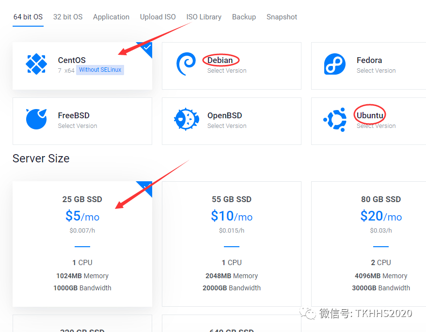 系统选CentOS 7 x64 选个5美刀的就够了(做号这个配置就够了,具体的还是要根据你的需求选择)