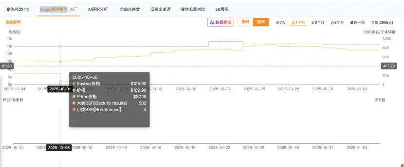 那这个价格对不对呢?利用卖家精灵插件的Keepa插件替代功能,选择近一个月,可以看到2025-10-8~2025-10-9,这个产品做了prime折扣,导致折扣后的价格是 $87.19。Rufus AI的回复是正确的。