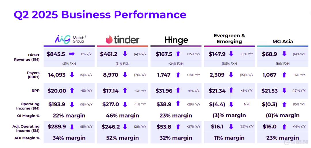 详细观察财报数据,Tinder 虽然持续挖掘用户的付费潜力,其 RPP(Revenue per Payers)同比增长了 3%,但架不住付费用户持续流失,收入仍出现了 4%的下滑。主打严肃交友的 Hinge 虽然增长依旧强劲,但从收入体量上仅是 Tinder 的不到四成,尚未达到能“拯救”公司整体业绩的程度。