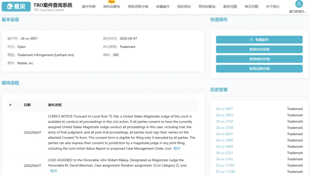 从赛贝TRO案件查询系统获悉,2026年4月7日,全球知名玩具巨头Mattel, Inc.(美泰公司,以下简称“原告”)发起商标+版权双重侵权诉讼,常年委托GBC律所维权,指控多名跨境电商卖家未经授权,销售盗用“怪兽高中”系列商标及版权作品的相关产品,涉及玩具( dolls、玩偶配饰)、服饰(童装、万圣节服装)、文具(笔记本、贴纸)、派对用品等类目。