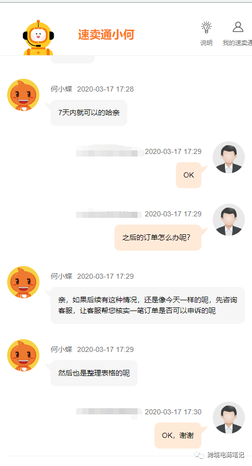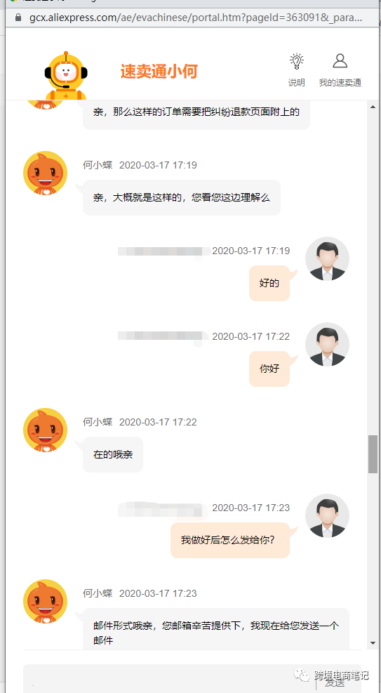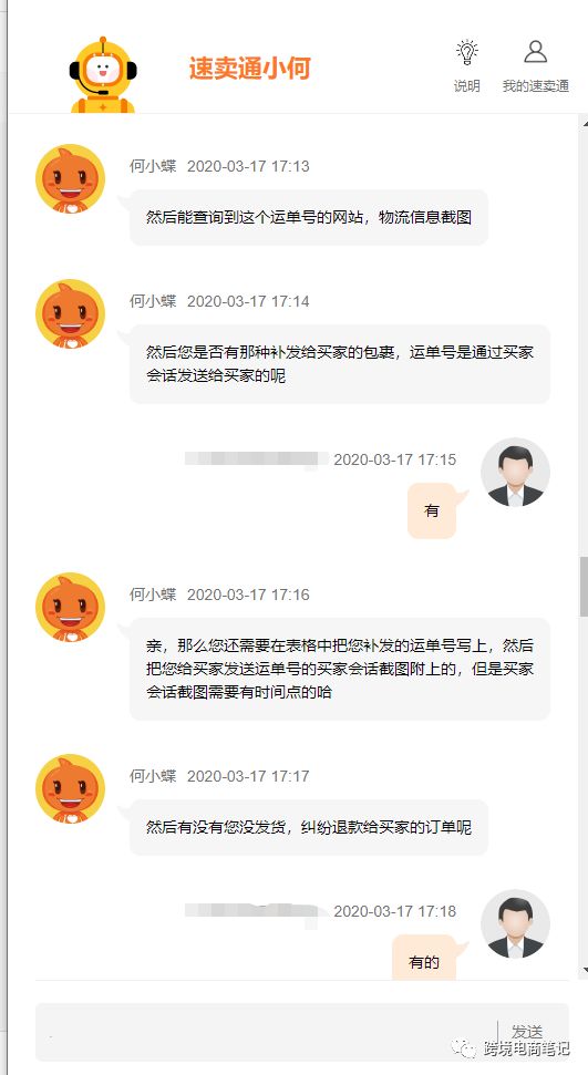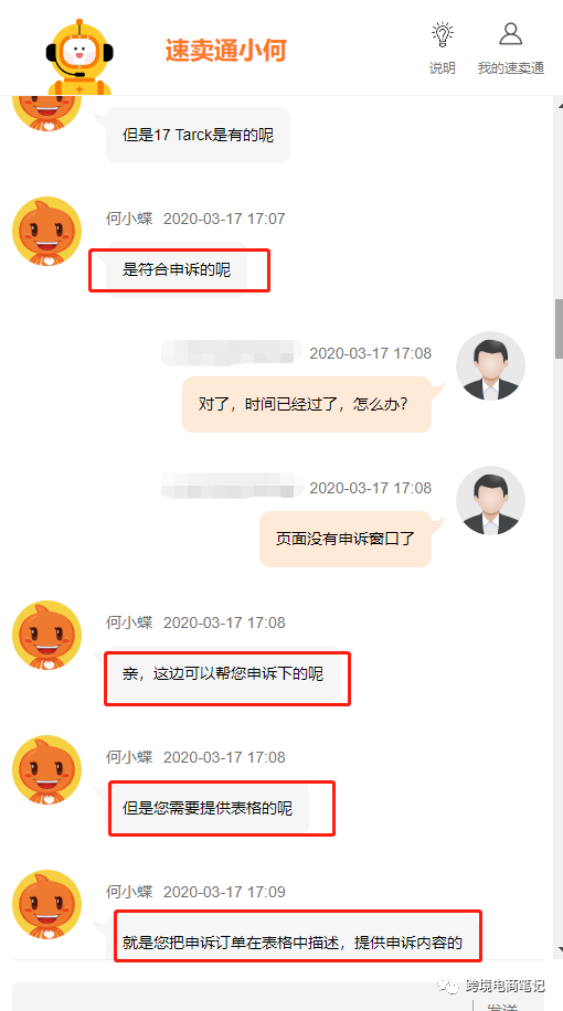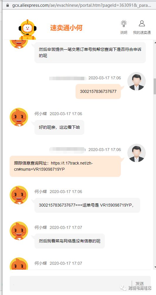 都正常发货呀,怎么就虚假发货被处罚了呢?突然看到,而且申诉时间已过,万一再次被查,处罚就更严重了,随即查询几个订单,速卖通平台无物流跟踪信息,但是https://www.17track.net/zh-cn能查询到全程信息,明白原因出在哪里了(ERP物流设置不正确),立即咨询速卖通客服,客服说可以申诉,附上对话,按照客服说的去照做就是了。
