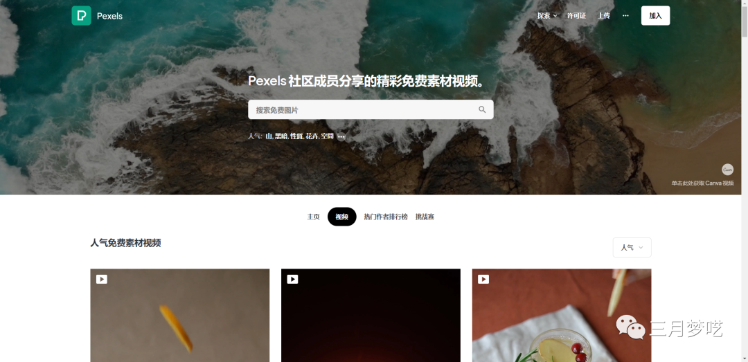 这个网站大家应该比较熟悉,一个提供丰富无版权图片的网站,但是很多人不知道,其实它还提供了丰富的视频资源可以下载,不需要注册登录就能下载,而且免费可商用。比起其他国外无版权素材网站,最方便的地方是支持中文搜索,而且除了图片、视频之外,还有一些插画、音乐、矢量图素材,可以免费下载并且商用。