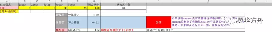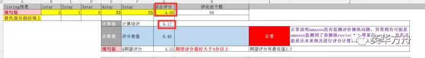 接下来说明【计算值】,因为计算有小数点的差值,而这个差值又可能有未算权重和普通差值一说。表格这里如果显示异常可能是Amazon监测到了你的操纵review不计算某些review的权重(目前一般来说都是不算5星的权重,目前是按这个来考虑),也有可能是还未来得及进行评分计算,需要人为定性。详细如下图,正常表示OK,异常表示需要小心了: