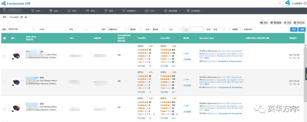 当填写完此关键信息后,下面就可以计算出来当前listing需要移除和增加多少个评价了,2018年了还用这个表格手动计算其实是很LOW的,下面就讲下一个软件工具里的listing监控功能,告诉大家2018年我们该有的工作方式! 因为一个listing的总评分 又由多个子asin组成而相互影响,要来个更加精细化的管理,将具体细节的知道到底是因为某一个子ASIN而引起整体问题的话, FusionzoomERP 的强大listing监控功能绝对能够省出你们大部分盯listing的人员时间出来: