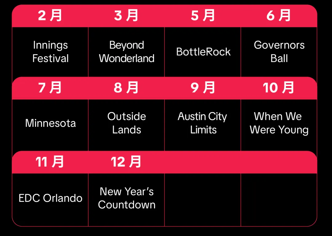 Live Nation 2026 美国音乐节年度资源覆盖全年核心文化节点与城市场景,助力品牌实现线下场景影响力、年轻高价值人群与长周期内容资产的整合触达。