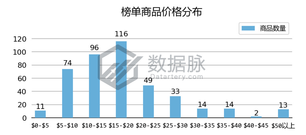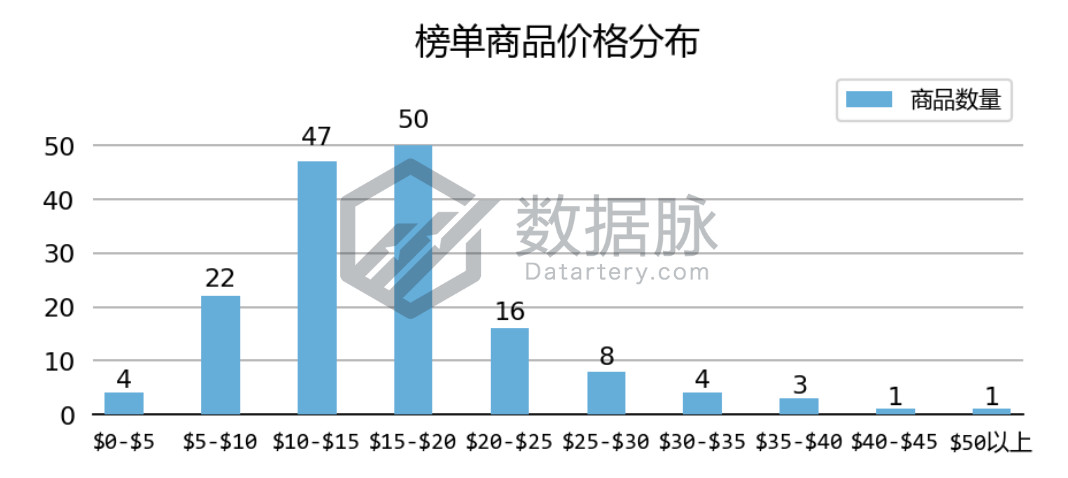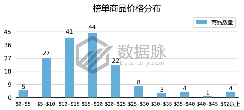 上周 Clothing, Shoes & Jewelry 品类 Movers & Shakers 榜单商品最高价$140.00, 最低价$0.01,平均价格$20.01。骆探长(shujumai.com)发现,在上榜的商品中, 其中,价格在$15.00-$20.00之间的商品数量较多,占上榜商品总数的27.49%,另有22.75%的上榜商品定价于$10.00-$15.00价格段。此外骆 探长(shujumai.com)发现,上周共有13款商品的定价达$50.00以上,站上榜商品总数的3.08%,相较于前几期分析,该周Movers & Shakers榜单的进榜商品均价依旧出现了小幅上升。