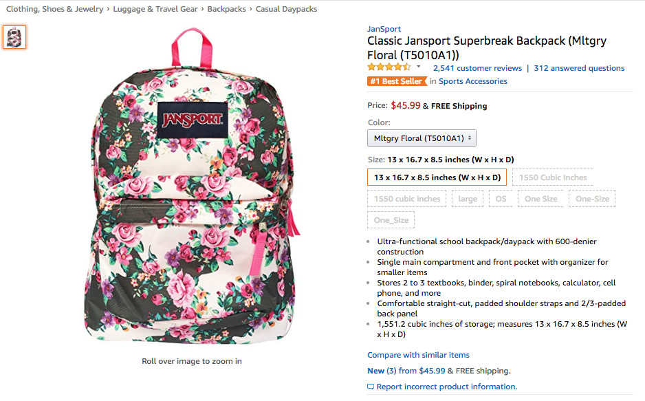 与此同时骆探长(shujumai.com)注意到,伴随着开学季的临近,来自品牌 JanSport的学生双肩包再度热卖,在一周中3次跻身Best Sellers榜单前三,位列综合排名第三。
