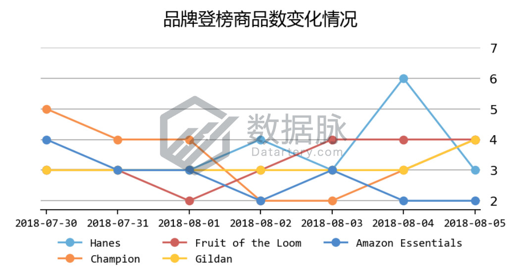 可以看到,在上周Clothing, Shoes & Jewelry品类的Best Seller榜单中, 品牌竞争较为激烈。最终,大品牌Hanes凭借在8月4日单日上榜6款商品的表现突出重围,取得了一周最多的登榜次数25次,位居品牌综合排名首位。与此同时,品牌 Champion、Fruit of the Loom、Gildan也有着稳定的榜单发挥,分别位列品牌综合排名的二、三、四位。