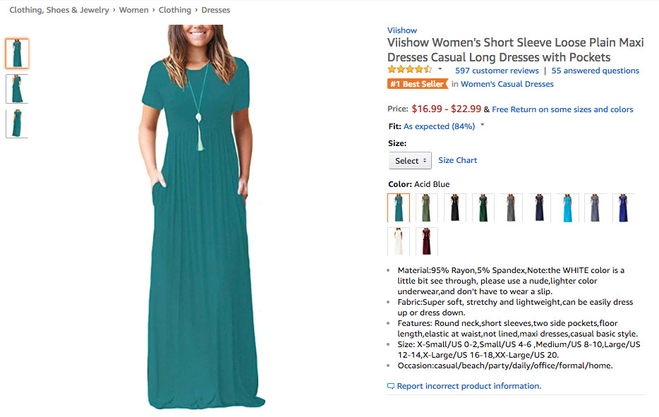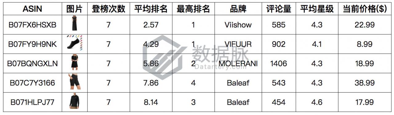 可以看到,在上周Clothing, Shoes & Jewelry品类的Hot New Releases榜单中, 一款来自品牌Viishow的女士短袖长连衣裙产品发挥相对稳定,在一周中5次跻身榜单前三,取得了平均排名2.57的不错成绩。