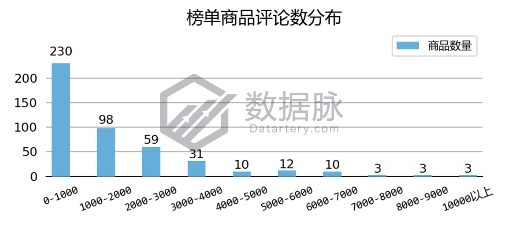 在上周登榜 Clothing, Shoes & Jewelry 品类 Hot New Releases 榜单的商品中, 单个商品拥有的最大评论数为6616.00条,最小评论数为0.00条,平均评论数504.88条,评论平均星级4.22星。 骆探长(shujumai.com)发现,其中38.10%的上榜商品评论数不超过80条,另有13.69%的上榜商品评论数在80到160条之间,同时有21款上榜商品 的评论数超过了1000条,占上榜商品总数的12.50%。此外,与前几期分析相比,该周进入Hot New Releases榜单的商品整体平均评论数同样出现了回升,具有一定口碑积累的商品重新占据榜单前列。