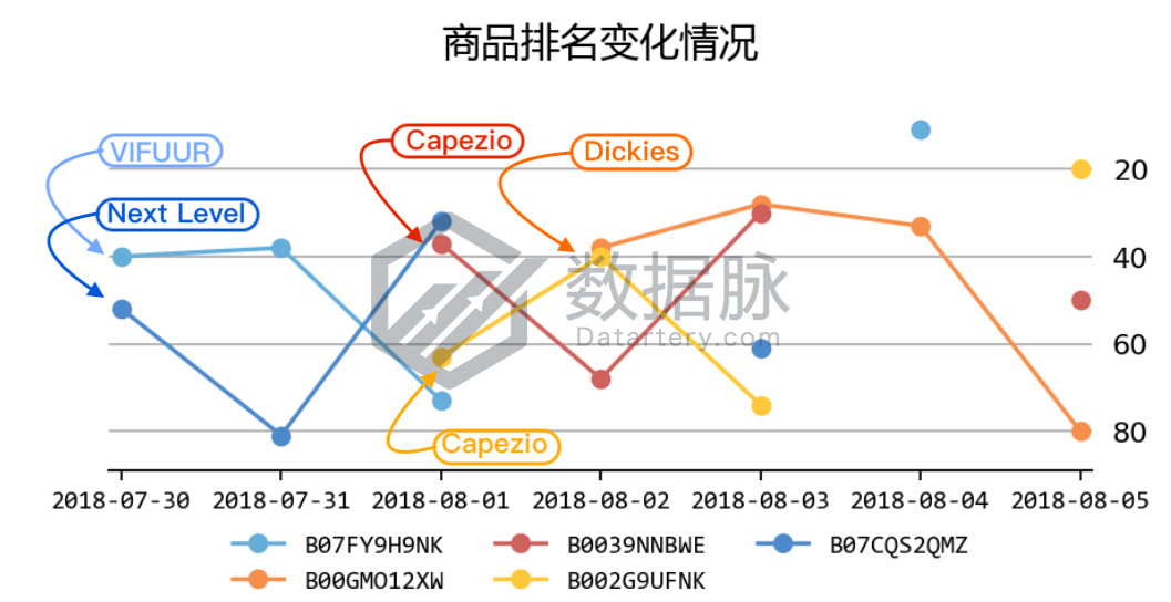 可以看到,在上周Clothing, Shoes & Jewelry品类的Hot New Releases榜单中, 亚马逊自营的服饰品牌Amazon Essentials再次重掌大权,在7天中共获得31次登榜,位居品牌综合排名首位。于此同时,骆探长(shujumai.com)注意到,男士秋装品牌 Wrangler也在上周有着突出的榜单表现,自7月31日开始每日的进榜商品数稳中有升,在一周中赢得了21次进榜,换季对市场的影响同样值得买家关注。