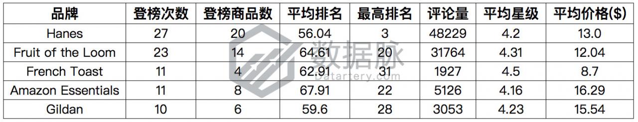 可以看到,在上周Clothing, Shoes & Jewelry品类的Movers & Shakers榜单中, 品牌Hanes再次发挥稳定,凭借一周登榜20款商品、登榜次数27次的综合表现稳居品牌综合排名首位;同时骆探长(shujumai.com)发现,服饰品牌 French Toast也在上周取得了11次进榜机会,以进榜商品平均评论星级4.5星的较高口碑位列品牌综合排名第三。