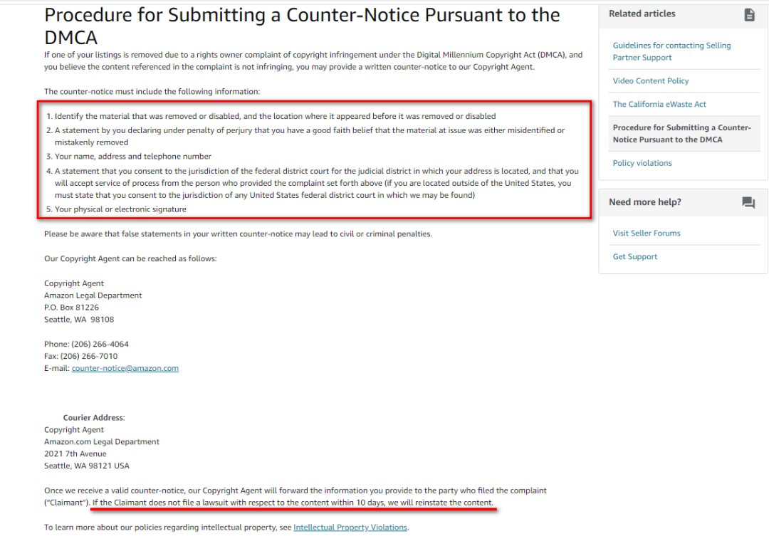 开 case 是万能的,基本遇到点啥都建议寻求官方客服的帮助。而亚马逊的客服团队,又以英文客服的水平(权限)比较高,中文客服一般没什么权力,但英文客服的回复效率比较慢,记得保持邮件跟进。截图你的 listing 创建时间,附上自己的原图,然后再附上这个人恶意投诉所有卖家截图(论坛有),手头上有的证据都附上。并且在邮件正文,清晰概括 listing 图片信息要点。还是那句话,别人乱搞,我们依然要从规则里突破,毕竟狗吠一声,我们不能和狗生气 😊亚马逊有个 DCMA 政策,全称 Digital Millennium Copyright Act,又名数字千年版权法 。想看详情的,后台搜索即可。- 反诉邮箱:counter-notice@amazon.com