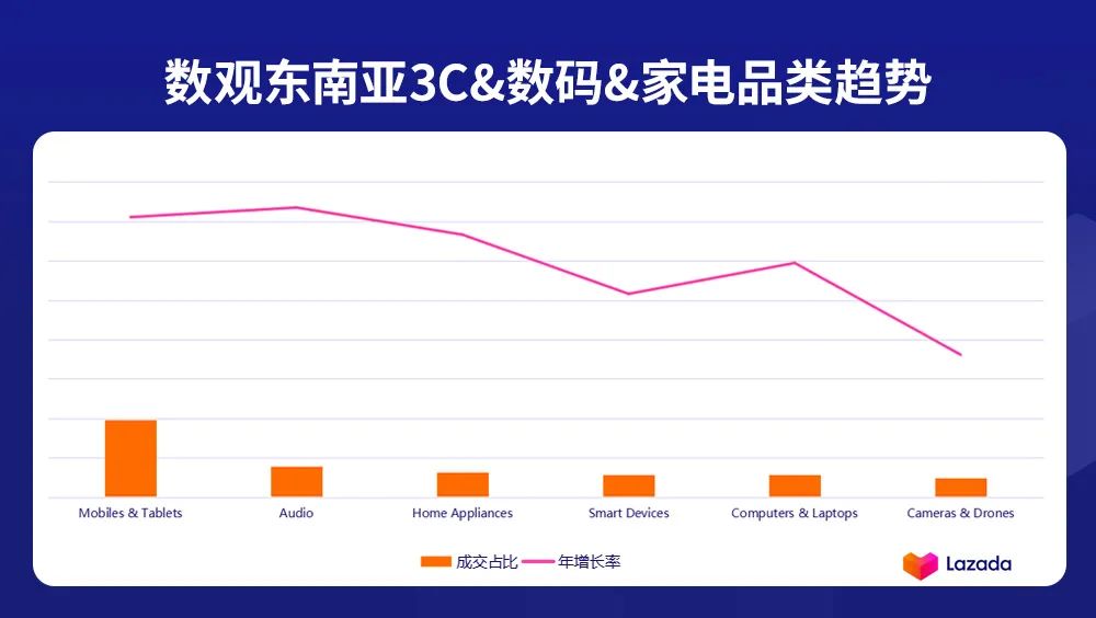 在东南亚市场,手机及相关配件占整个3C数码类目的大头,增速势头明显,影音、家电、智能设备、电脑及相关配件、数码相机&无人机成交均保持稳定增长,因此商家可多关注相关商品。