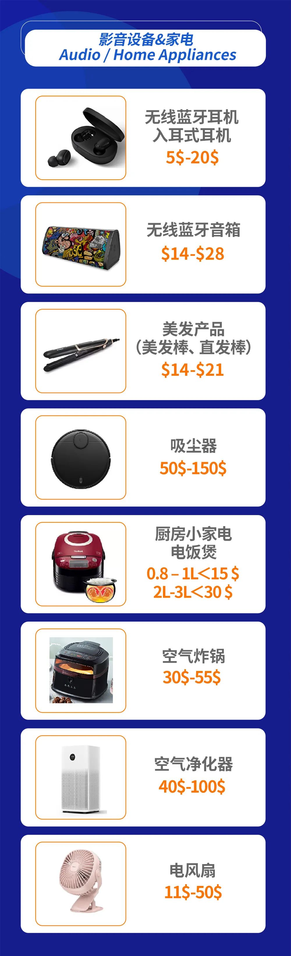 手机、耳机、电脑配件和相机配件在东南亚市场十分畅销,其中智能家电在各国市场都十分流行,尤其是小型家用电器、小型厨具和电视配件等商品,因此商家在上新此类产品时,应多多关注时尚精巧且小型的家用电器。