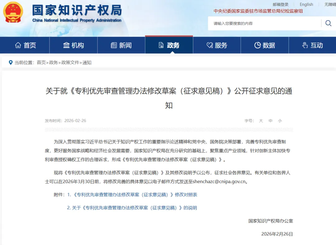 26日,国知局发布《专利优先审查管理办法修改草案(征求意见稿)》公开征求意见的通知。并同步附上了《专利优先审查管理办法修改草案(征求意见稿)》修改对照表。