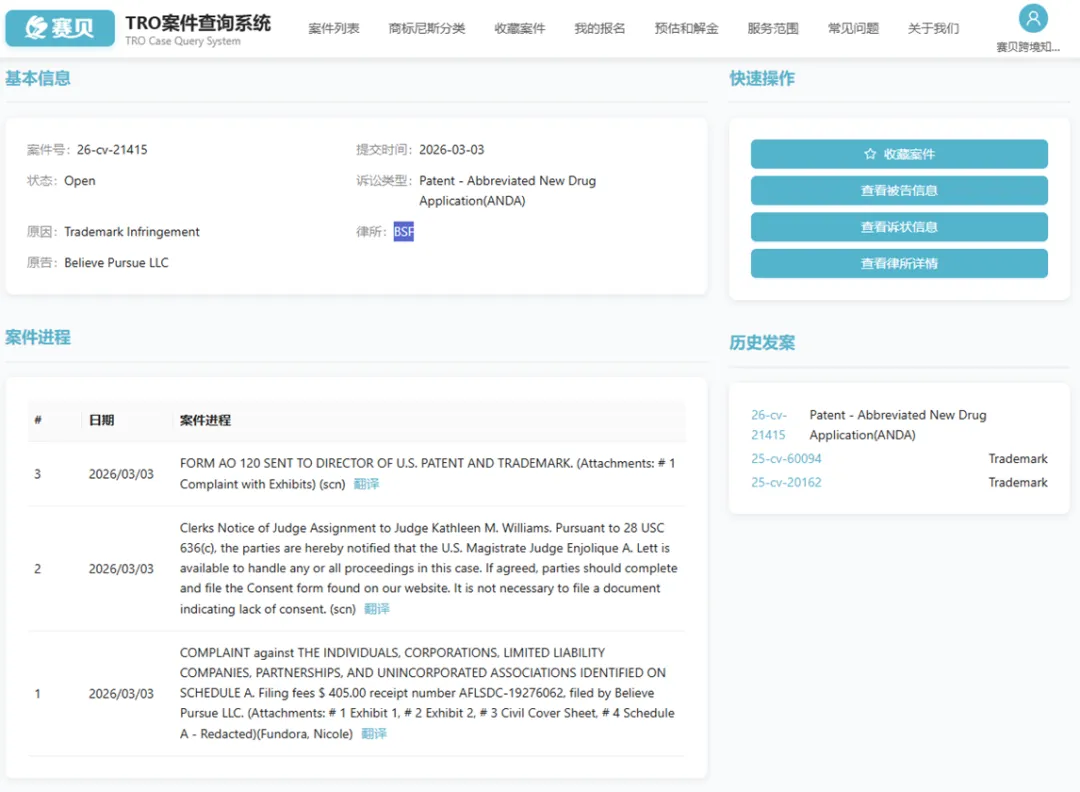从赛贝TRO案件查询系统获悉,2026年3月3日,原告Believe Pursue LLC在美国佛罗里达州法院发起商标及专利侵权TRO,BFS律所代理此案,指控33名Ebay卖家侵犯其“BELLABOOTY”商标及髋部推力运动腰带设计专利的侵权产品,目标明确针对中国卖家。