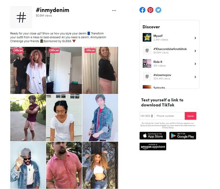 话题标签:多以挑战形式出现,品牌方发起“#”话题,邀请用户参与挑战,从而进行品牌推广。例如在2018年返校季,潮流服饰GUESS发起#InMyDenim挑战赛,邀请用户展示自己的牛仔服饰,并邀请4位KOL率先参与。最终仅6天就获得5500+的用户参与。去年TikTok 还推出了可购物广告格式,在话题中添加购物组件,引导用户进入购买链接完成转化。