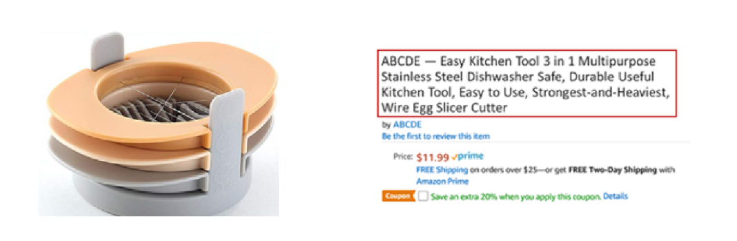 具体分析:核心词Egg Slicer放在了最后,排列混乱,堆砌形容词,导致标题过长在手机端易被折叠,消费者也找不到关键信息。