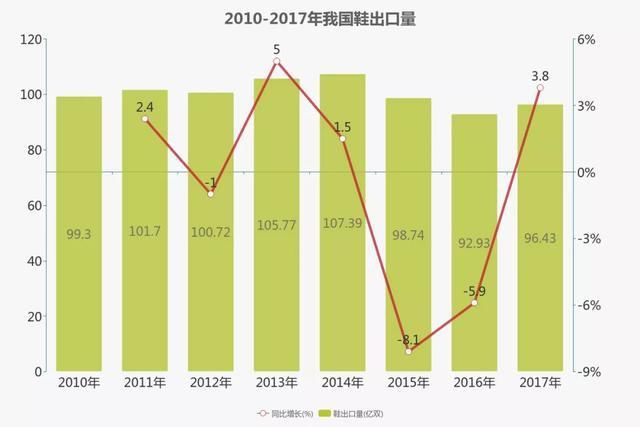 数据显示,2017年中国鞋出口扭转颓势,出口数量和金额双增长,全年出口量达到96.43亿双,较上年增长3.77%;出口额达到456.60亿美元,同比增长1.74%。