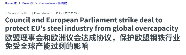 欧盟在最新公告中称,该项临时协议将确立新的监管框架,以保护欧盟钢铁业免受全球产能过剩和贸易转移的冲击,同时确保措施符合欧盟的国际贸易义务,并为下游产业等经济运营商提供必要灵活性。