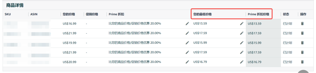 我们把prime折扣后的价格和您的最低价格写成一样的价格,这样就不会因为prime折扣价格低于允许的最低价格报错:
