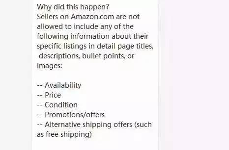 而沿着这些不可用的词语往下扒,还有卖家在收到的账号受限的邮件中被提醒,以下词语同样不可用于Listing详情中,包括但不局限于:Availability, Price, Condition, Promotions, Offers, Aternative Shipping Offers(Such As Free Shipping)等等,所以,在此也提醒各位卖家能够在核查自己的Listing时,一并将上述词语也进行删除或者修改。