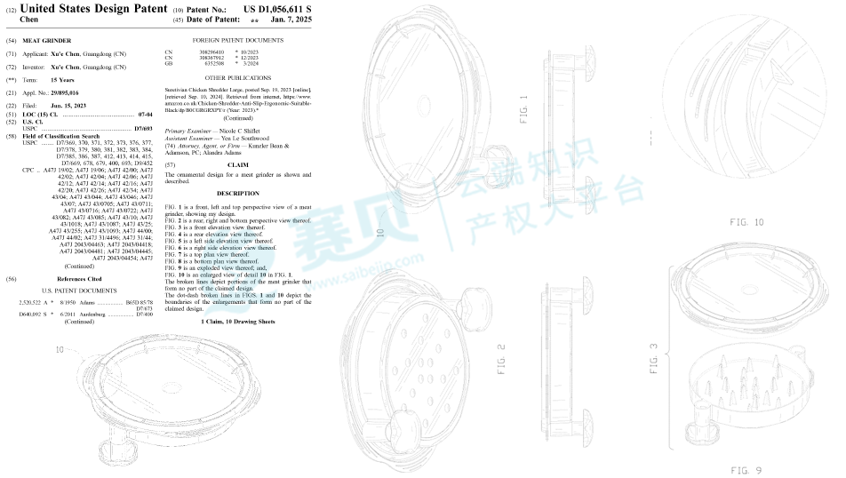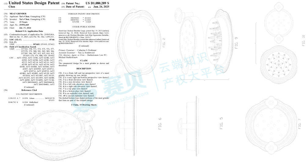 这次 Xu'e Chen 维权靠的是两项美国外观设计专利,都叫 Meat Grinder(肉类研磨机),专利USD1056611于2025年1月7日授权,明确保护了绞肉机的多个核心外观特征;专利USD1080289于2025年6月24日授权,在第一个专利的基础上,把绞肉机的外观保护做得更周全。