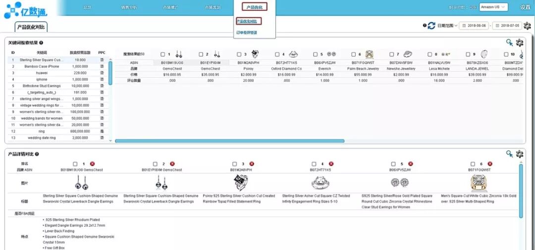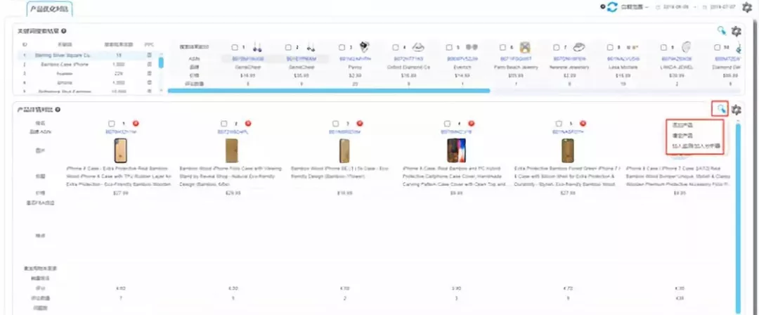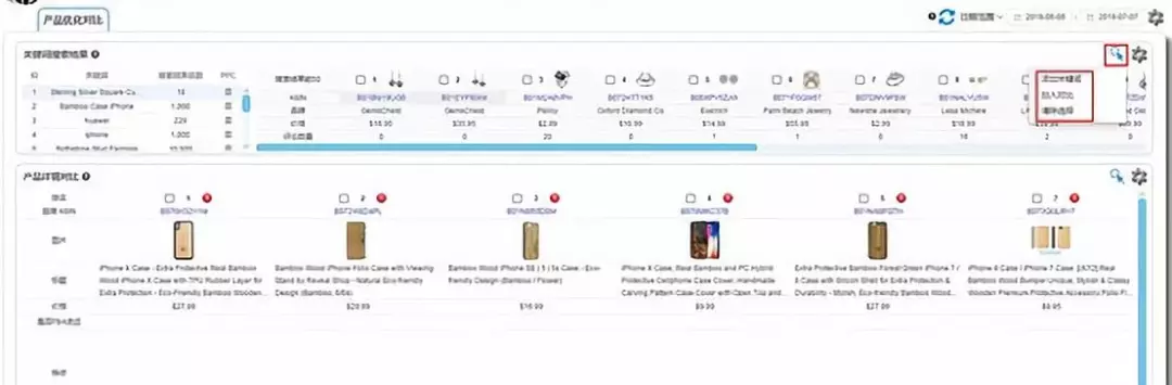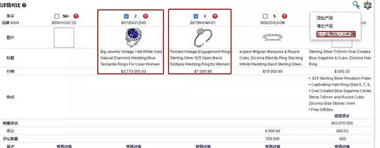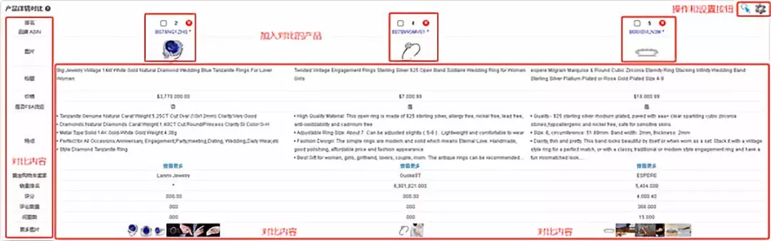 【产品详情对比】分析器:对比在【关键词搜索结果】中选定产品的详情。