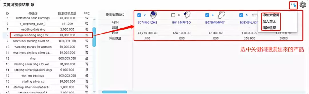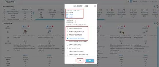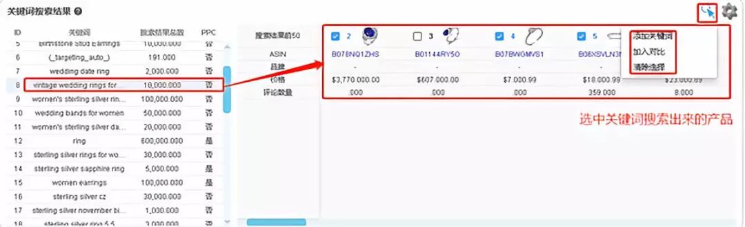 选择一个关键词,在【搜索结果前50】的产品列表中,在产品的左上角的方框中勾选,点击加入对比,勾选的产品会在【产品详情对比】分析器中出现。点击清除选择,清除选中的产品。