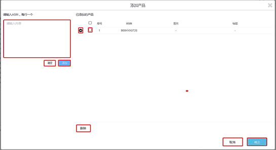 点击添加产品,进入添加产品界面。在输入框中输入ASIN码,添加到【已添加的产品】列表中,可以在这个列表中删除产品,添加完成后点击确认。