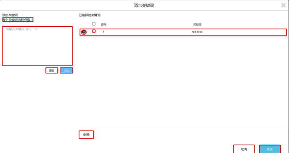 点击添加关键词 ,进入添加关键词界面。在左边的输入框中输入关键词,可输入多个关键词(一行一个关键词)。点击添加,将关键词添加到【已选择的关键词】列表中;点击清空,清除输入框中的关键词。在【已选择的关键词】列表中,点击关键词前面的减号图标 进行删除或者勾选关键词点击删除按钮。添加完成后,点击确定保存。