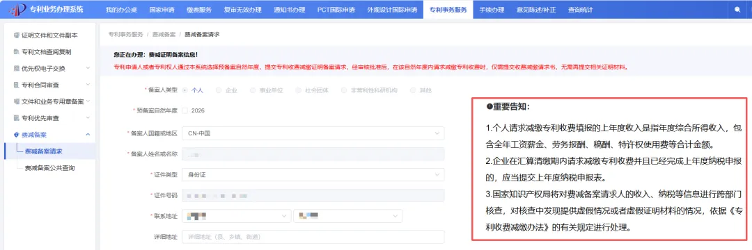 小编发现,近日,国家知识产权局针对“专利业务办理系统”的“费减备案请求”页面进行更新。