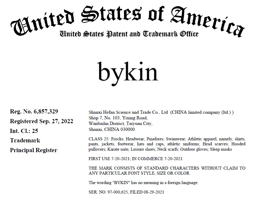 原告Shanxi Hefan Science and Trade Co., Ltd是国内的贸易公司,注册文字商标 bykin 注册在25大类服饰品类: