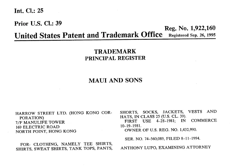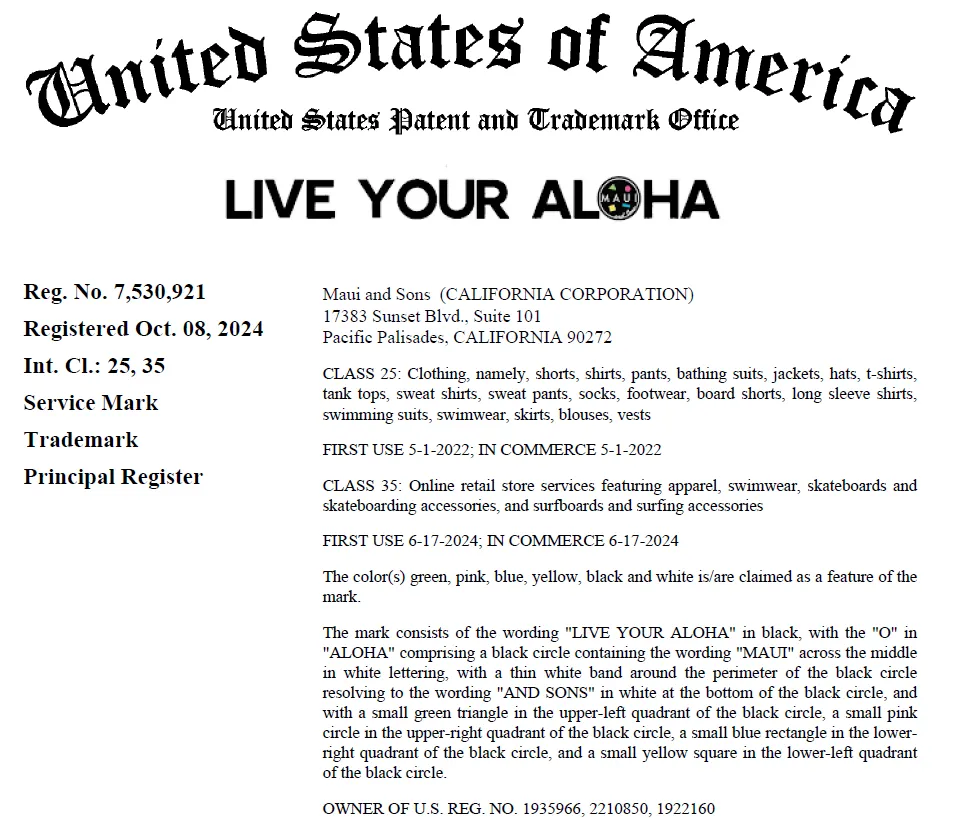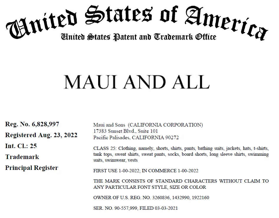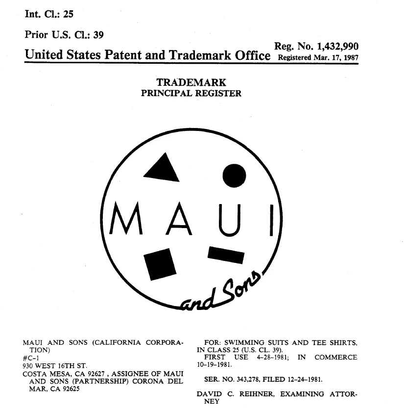 原告Maui and Sons是一个源自美国加州的冲浪与滑板生活方式品牌,成立于 1980年。