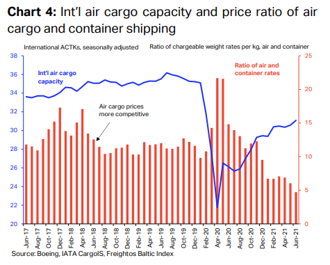 据国际航空运输协会IATA最新数据,尽管国际空运同样处于运力紧张状态,相较海运的极端拥堵和价格飞涨,空运在高时效的运输优势下,价格优势尽显——空运与集装箱海运价格比率持续走低,国际空运货运运力缓慢恢复,且在未来数月将保持该走势不变。