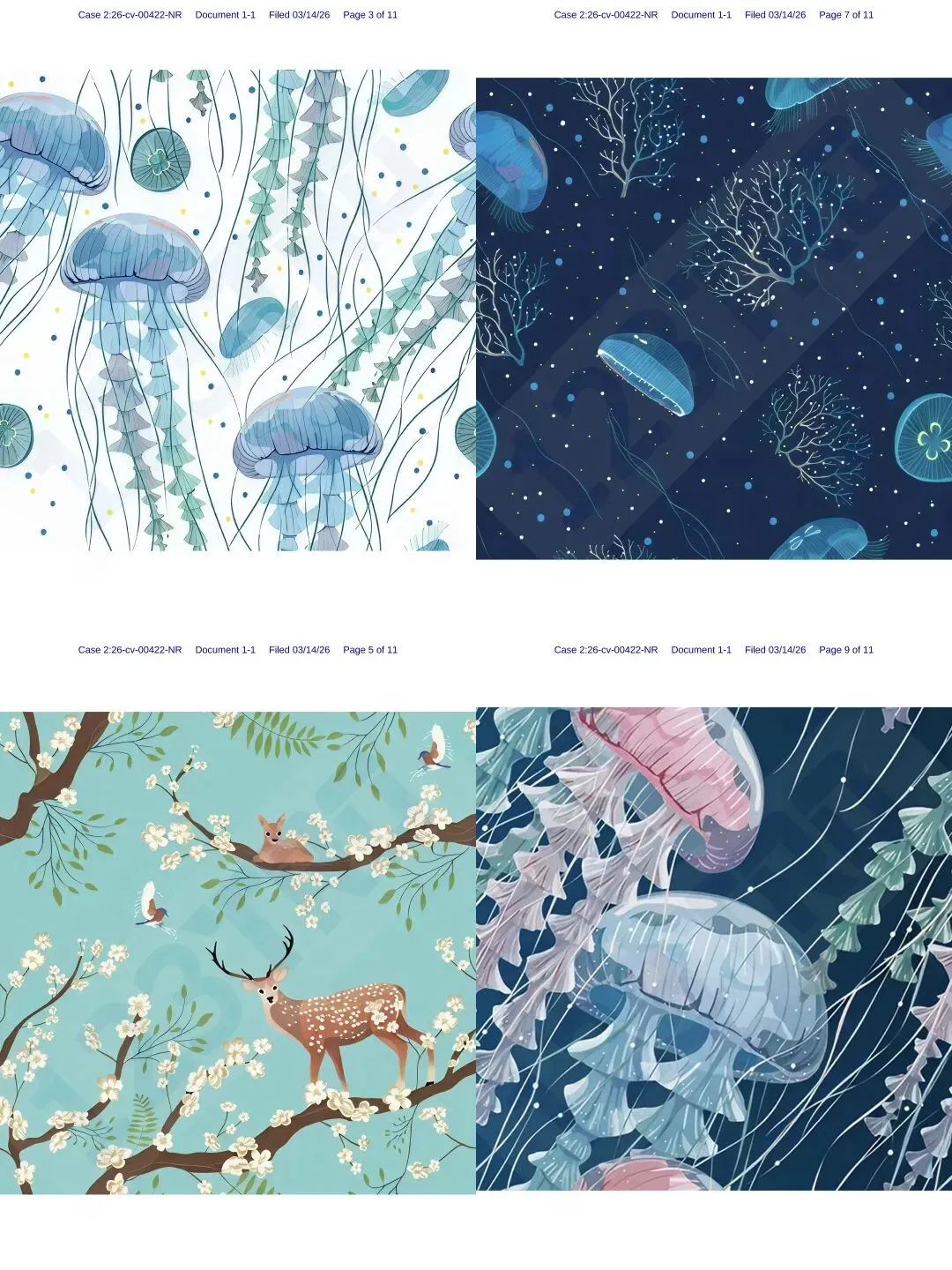 据美国法院官网的最新资料,我们关注到近期四起全新版权TRO案件,共涉及32幅全新插画图版权,分别是:Ference代理发起的Bonnie 动物搬书插画【26-cv-00432】,Zdravko 拼贴艺术画【26-cv-00435】,ARTEM 动物与眼球平铺图案【26-cv-00422】,Nikita 美妆摄影作品【26-cv-00419】;根据诉状提示,四起案件均有数百家店铺被波及,但目前被告名单还未公开。