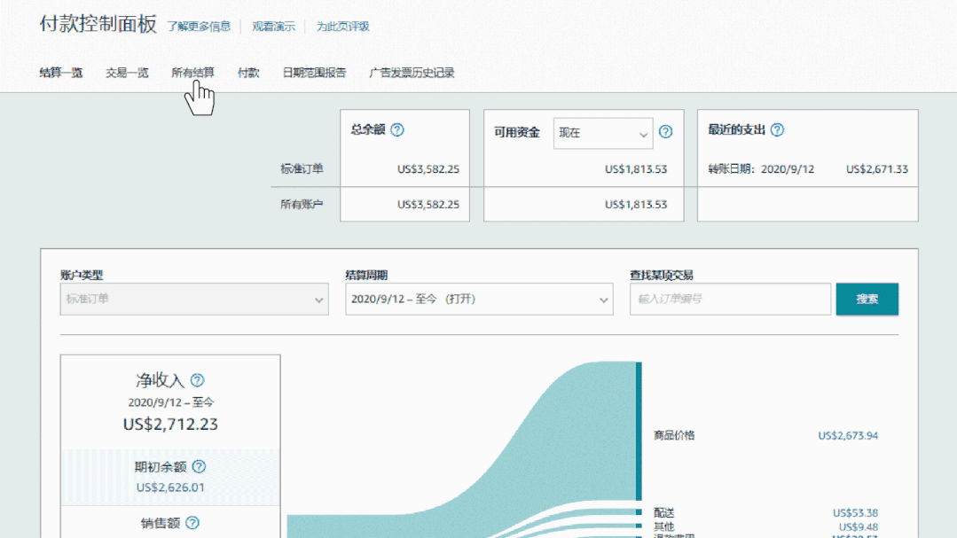 您能直观地从卖家平台看到、还可以下载详尽的数据报告,步步追踪收款全过程!比如,选择“数据报告”并单击“付款”就可以进入“付款控制面板”,查询到“结算一览”、“所有结算”等报告。