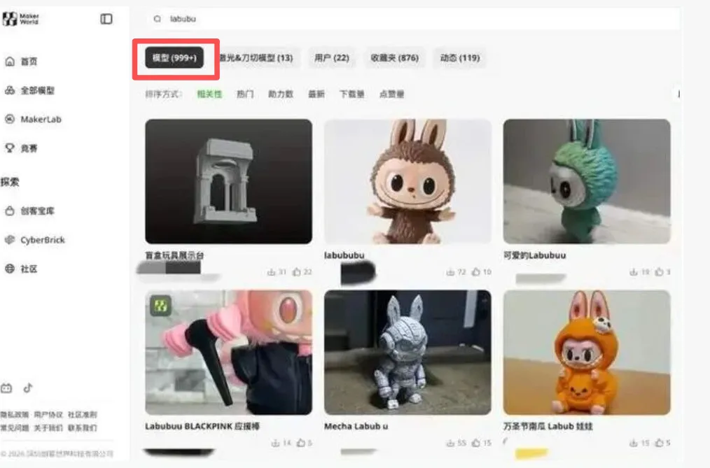 而在MakerWorld上,曾有大量未经授权的Labubu 3D打印模型,单个热门模型下载量超5万次;