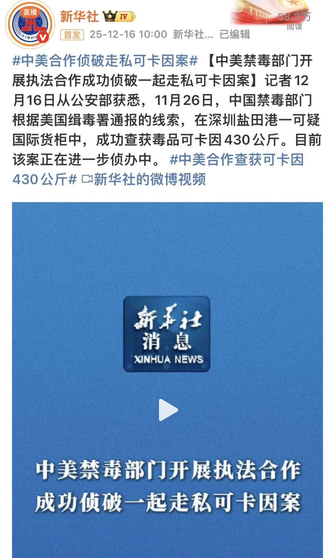 12月16日上午新华社报道称,11月26日我国禁毒部门依据美国缉毒署(DEA)提供的线索,在深圳盐田港对一个可疑国际货柜展开检查,查获了高达430公斤的毒品可卡因。