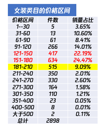 我们看这样一个例子,以我们做女装为例,我们分析每个价格区间段,对应的产品数量跟产品的销量,发现了一个有趣的事实:东南亚的顾客对价格及其敏感,在121-180台币的价格带区间,产品只要款式对了,是非常畅销的,在121-180台币的价格带,总销量贡献了超过45%,将近一半;