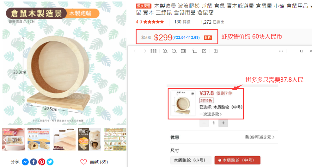 我们通过卡价格跟销量区间,在宠物一级类目下,找到这个仓鼠滚筒,根据Shopee前台的售价,我们在拼多多找同款,利润空间还有22.2元;毛利可以去到37%;