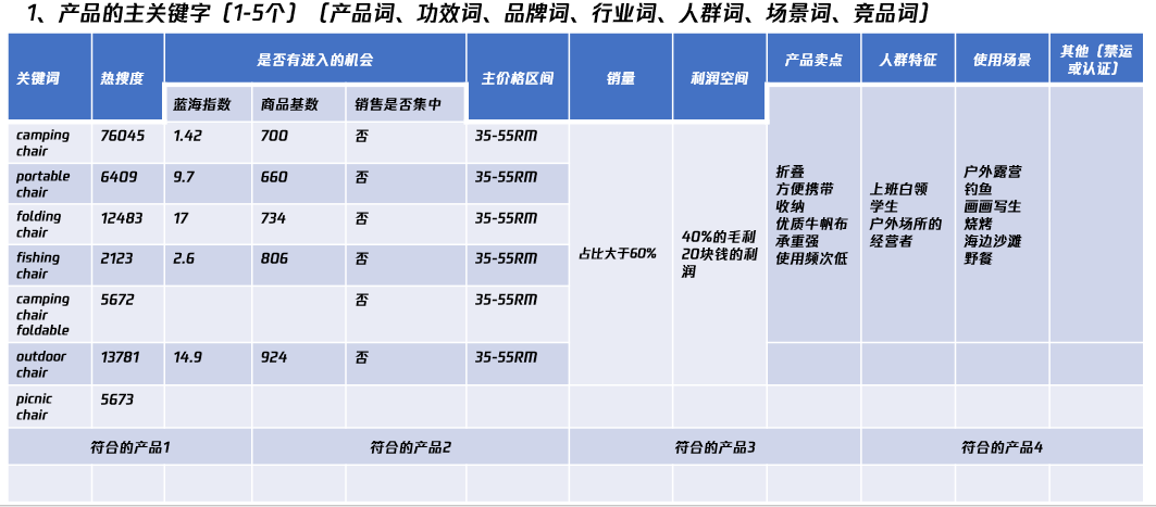 以上这些因素通通需要考虑进去,考虑了这些因素之后,我们会形成一张选品表格: