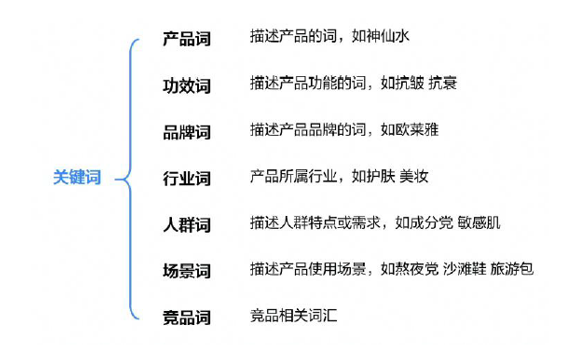 在一个关键字下面,我们通常会选出5款左右满足需求的产品。在选品过程我们可以发现,每一个产品,它有关系的强关联关键词不会太多,一般在1-5个之间,这些关键词可以划分为产品词、功效词、品牌词、行业词、场景词、竞品词;
