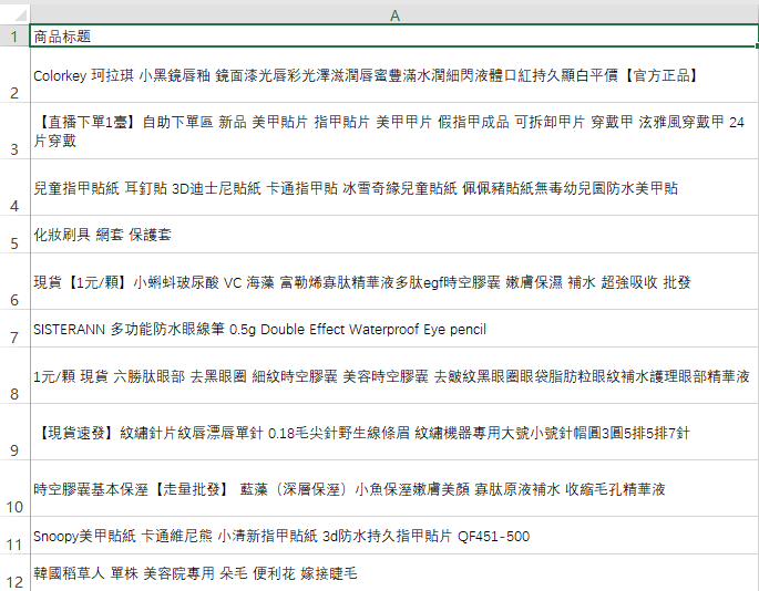我们的都知道,标题跟关键字是密不可分的,产品的标题里面一定带关键字的,而同一个类目下,必定会有某些关键字是重复的;我们只要把重复的关键字的频次找出来,那么就能掌握某一个类目的主要关键字了。