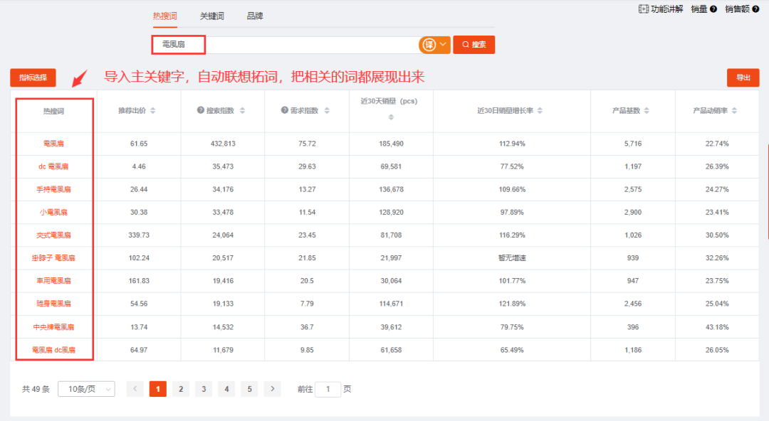 怎么找到蓝海关键字,还是的用工具:先把我们找到的词,导入到热搜词中,工具就会自动帮我联想和拓词,然后把一系列有关的词都挖掘出来,并且,会给出相应的搜索度、产品基数等关键指标的字段。