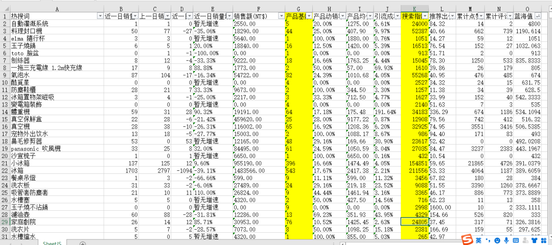 其实还真有,我们自己有一个蓝海词查词软件,就专门干这个事情。下面就是我们自己用软件把台湾站点的所有关键词都跑一遍,然后出来了13万个蓝海关键字;而且我已经按类目、按关键字热搜度、按蓝海值的从大到小排序,我都做好了。