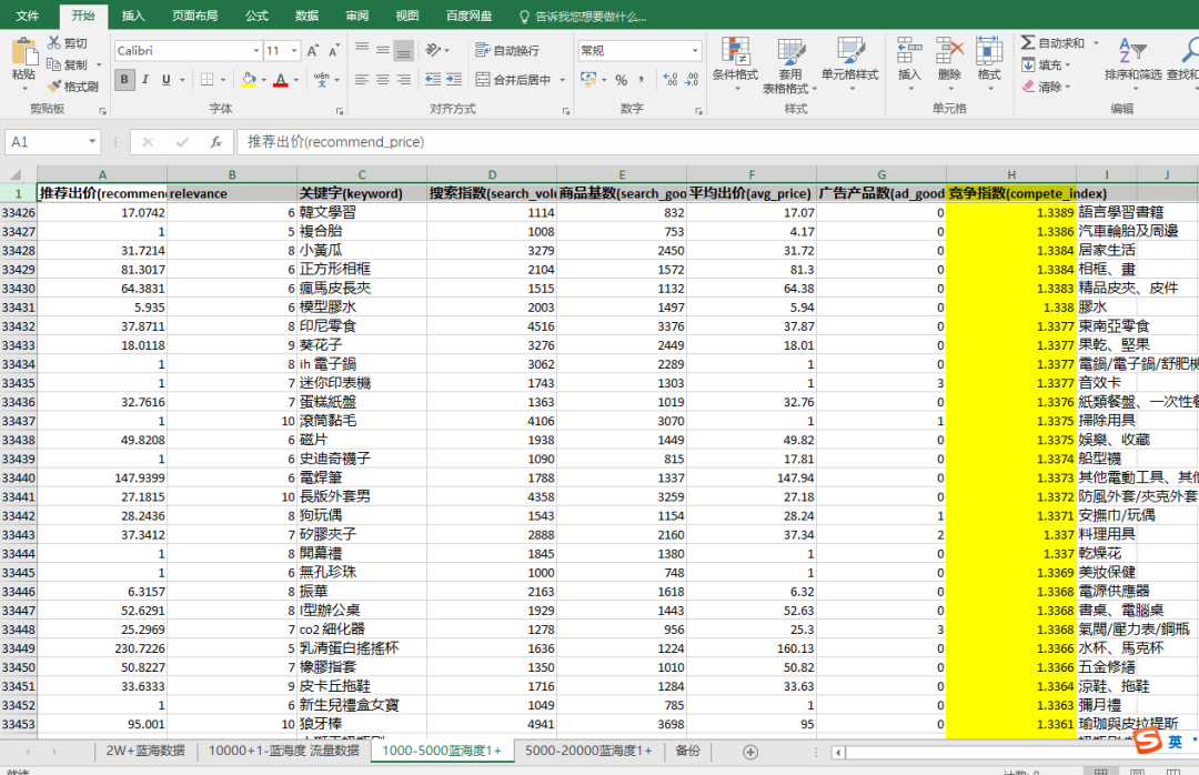 然后再把数据导出来,可以看到一共有1000条数据,我们在根据每个词的热搜度以及产品基数,自己算出每个关键字的蓝海值;像这样: