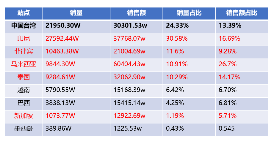 3)同理,可分析得出,泰国、巴西、新加坡等站点的数据情况也不错。从销量占比,跟销售额占比的维度来说。要比中国台湾要舒服。