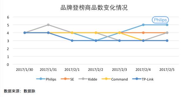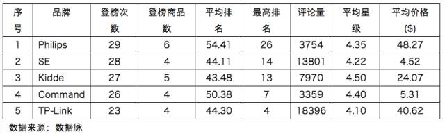 可以看到,在上周 Home Improvement 品类的 Best Seller 榜单中,各大品牌竞争焦灼。最终,品牌 Philips 凭借更加稳定的发挥,以一周内总登榜次数29次、登榜商品数6款的成绩,险胜同样强劲的榜单对手 SE、Kidde、Command,以微弱的优势位列品牌综合排名首位。